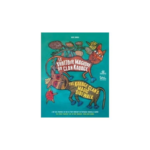 C’est en 1969 que le couple Beier en provenance d’Afrique débarque à Port Moresby, capitale de la Papouasie-Nouvelle-Guinée au coeur du Pacifique sud, avec pour mission universitaire de créer les conditions de l’émergence de l’art contemporain. Quelques précurseurs vont rapidement s’imposer dans l’embryon de centre d’art des Beier, et parmi eux Marie Taita Aihi qui fonde un atelier de textile aux motifs saisissants, Jakupa Ako, dont les peintures surprenantes sont inondées de soleil, et Timothy Akis qui dessine à merveille des figures oniriques qu’il qualifie de réalistes. Quand ce dernier, garçon de courses au service d’un anthropologue, exposa pour la première fois, Mathias Kauage, agent de nettoyage, fit partie des invités, les Beier ayant pris soin d’inviter des gens de la rue afin de ne pas troubler les artistes peu habitués aux mondanités. Kauage fut subjugué par l’exposition et il ne cessera dès lors de proposer son propre parcours de dessinateur, graveur et peintre avec succès. Il sera encadré par le couple Beier. Kauage décéda en 2004. Le clan Kauage, qui l’avait secondé dès le début de l’épopée, composé de nos jours d’une dizaine de peintres actifs, perpétue son oeuvre pour le plus grand plaisir de tous. «Le Trottoir magique du clan Kauage » sous-titré «L’art des peintres de rue de Port Moresby en Papouasie-Nouvelle-Guinée » retrace les étapes de l’avènement de Kauage et suit son aura artistique au travers des oeuvres du clan composé d’individualités fortes. Il s’agit à présent d’une école bien implantée, très active, solidaire, à l’affût de l’actualité, s’inscrivant dans un cadre de développement durable.