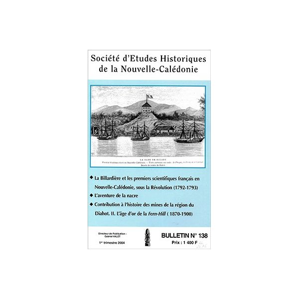 Table des matières du bulletin n° 138 (1er trimestre 2004) de la Société d’études historiques de la Nouvelle-Calédonie : -« La Billardière et les premiers scientifiques français en Nouvelle-Calédonie, sous la Révolution (1792-1793) » par Gabriel Valet, -« L’aventure de la nacre » par Luc Legeard, -« Contribution à l’histoire des mines de la région du Diahot. II L’âge d’or de la Fern-hill (1870-1900) » par B. Delvinquier et P. Jegat.