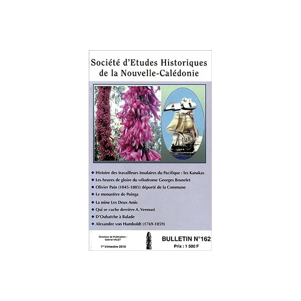 Table des matières du bulletin n° 162 (1er trimestre 2010) de la Société d’études historiques de la Nouvelle-Calédonie : -« Histoire des travailleurs insulaires du Pacifique : les Kanakas » par Jerry Delathière, -« Les heures de gloire du vélodrome Georges Brunelet » par André Jacquier, -« Olivier Pain (1845-1885) déporté de la Commune » par Luc Legeard, -« Le monastère de Poinga » par Daniel Morignat, -« La mine Les Deux Amis » par André Jacquier, -« Qui se cache derrière A. Vermast » par Benoît Delvinquier, -« D’Oubatche à Balade » par Benoît Delvinquier, -« Alexander von Humboldt (1769-1859) » par Gabriel Valet.